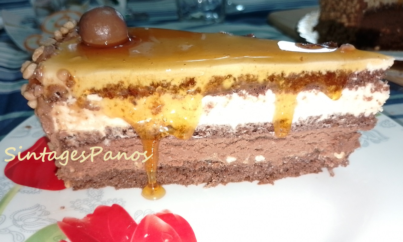 - Τοποθετούμε και το τρίτο παντεσπάνι, σιροπιάζουμε, και καλύπτουμε με ένα λεπτό στρώμα μους μους καραμέλας που μας έμεινε. Δεν θέλουμε να έχουμε περισσότερο από 1/2 εκ. πάχος μους.